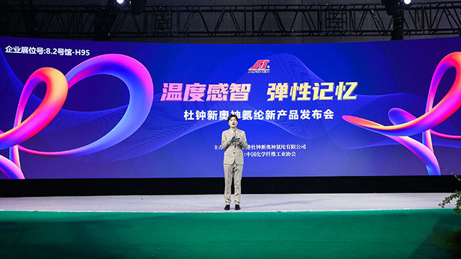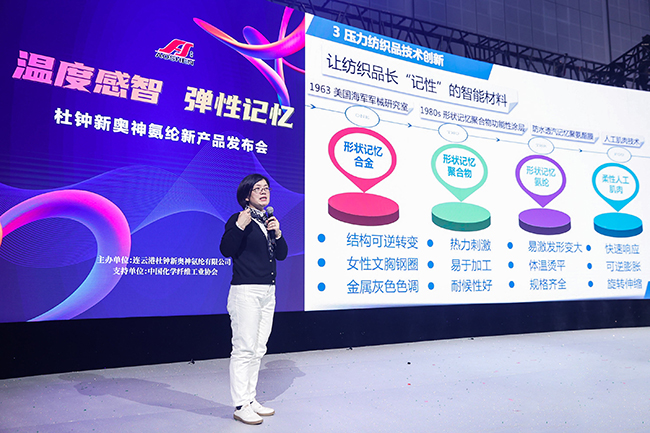 發(fā)布會(huì)上,中國(guó)化學(xué)纖維工業(yè)協(xié)會(huì)會(huì)長(zhǎng)陳新偉發(fā)表了熱情洋溢的發(fā)言。他簡(jiǎn)要回顧了氨綸行業(yè)近年來(lái)高速發(fā)展的歷程,推介了連云港杜鐘新奧神氨綸有限公司創(chuàng)新發(fā)展,引領(lǐng)差別化功能性氨綸的生動(dòng)實(shí)踐。連云港杜鐘新奧神氨綸有限公司總經(jīng)理張斌致辭,表達(dá)了對(duì)出席發(fā)布會(huì)各位領(lǐng)導(dǎo)來(lái)賓的熱烈歡迎。連云港杜鐘新奧神氨綸有限公司技術(shù)市場(chǎng)部部長(zhǎng)尹鐵強(qiáng)重點(diǎn)介紹了兩款差異化氨綸新產(chǎn)品——奧神®溫感形狀記憶氨綸和消臭氨綸的特點(diǎn)和性能,用大量實(shí)驗(yàn)數(shù)據(jù)和后道應(yīng)用實(shí)例闡釋了產(chǎn)品的與眾不同。江南大學(xué)教育部針織技術(shù)工程研究中心副教授萬(wàn)愛(ài)蘭簡(jiǎn)述了江南大學(xué)與連云港杜鐘新奧神氨綸有限公司深入開(kāi)展“產(chǎn)學(xué)研用”歷程,并從壓力紡織品現(xiàn)狀分析、溫感形狀記憶氨綸的應(yīng)用研發(fā)以及形狀記憶紡織品發(fā)展趨勢(shì)等方面進(jìn)行闡釋。與會(huì)代表對(duì)公司推出的兩款差異化氨綸新產(chǎn)品——奧神®溫感形狀記憶氨綸和消臭氨綸表現(xiàn)出了極大的熱情和關(guān)注。最后,總經(jīng)理張斌接受了來(lái)自紡織服裝周刊、中國(guó)紡織報(bào)、中國(guó)紡織、騰訊視頻、中國(guó)化學(xué)纖維等媒體的采訪。