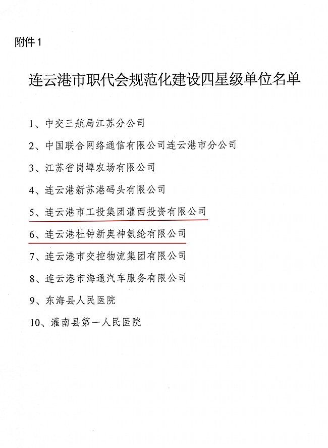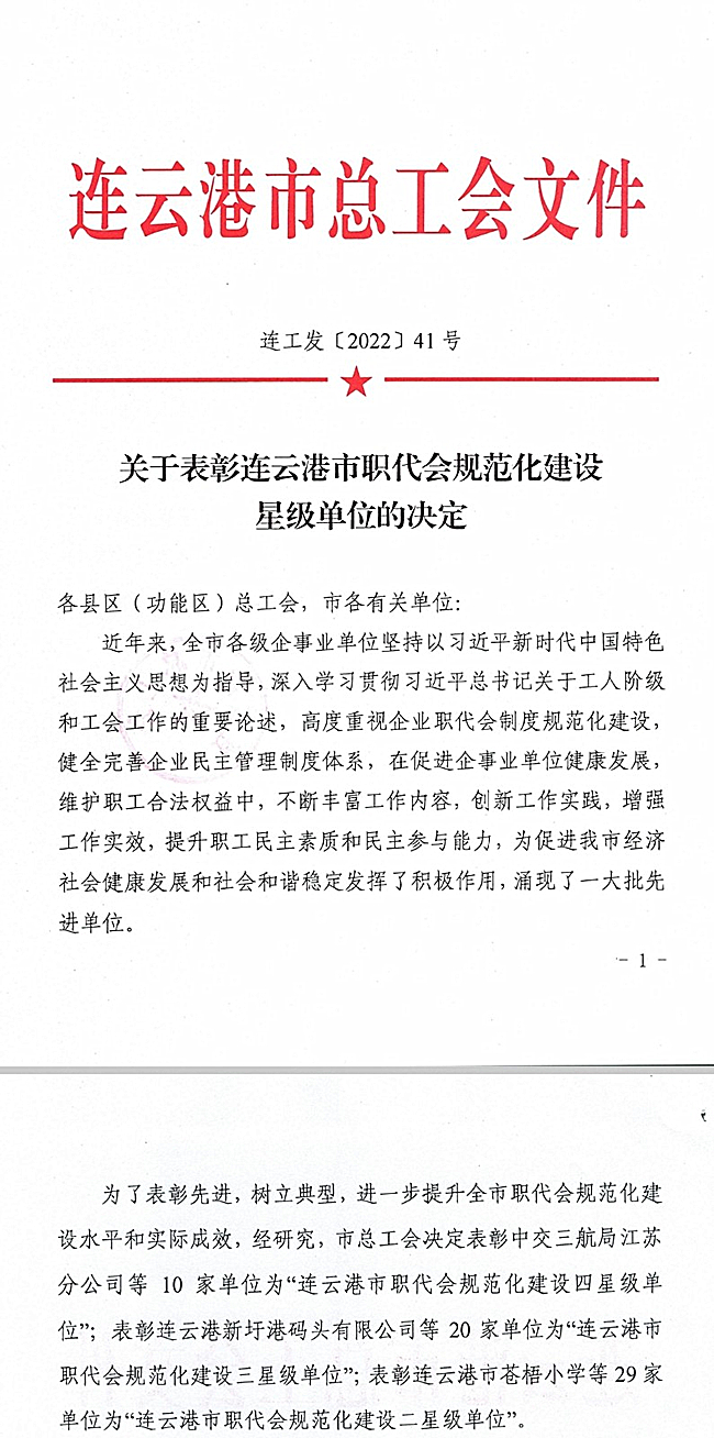 日前,從連云港市總工會傳來喜訊,我公司工會被授予“四星級職代會”榮譽稱號。