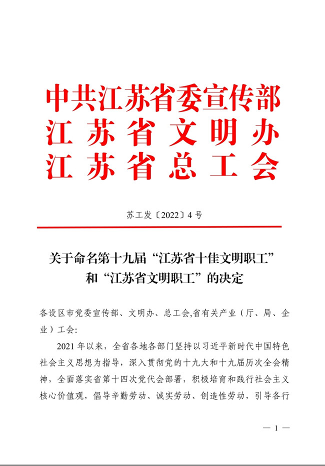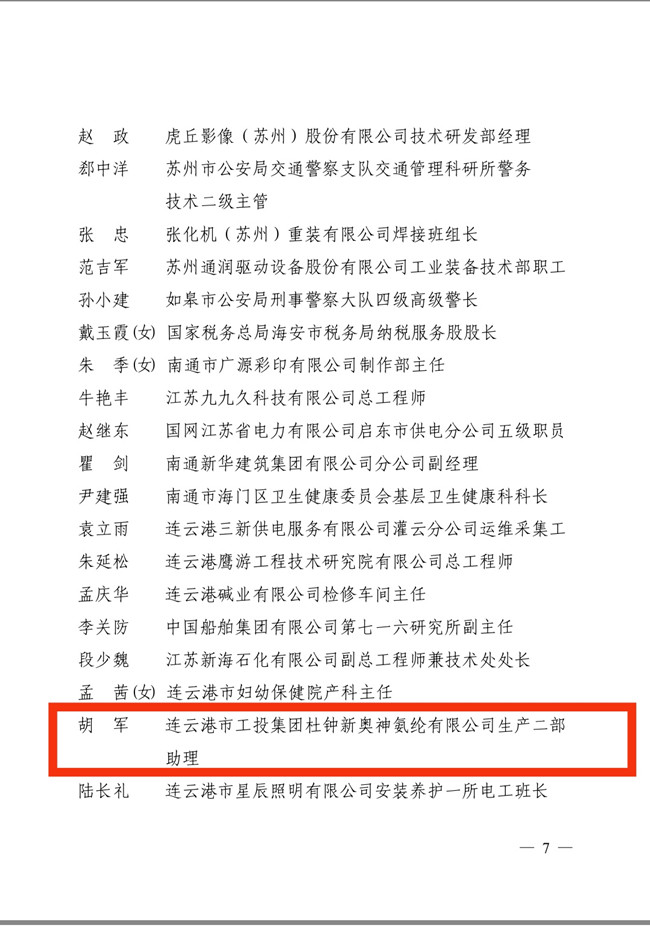近日,由江蘇省委宣傳部、省文明辦、省總工會聯(lián)合開展的第十九屆“江蘇省十佳文明職工”評選活動結(jié)果揭曉。氨綸公司員工胡軍榮獲“江蘇省文明職工”稱號。