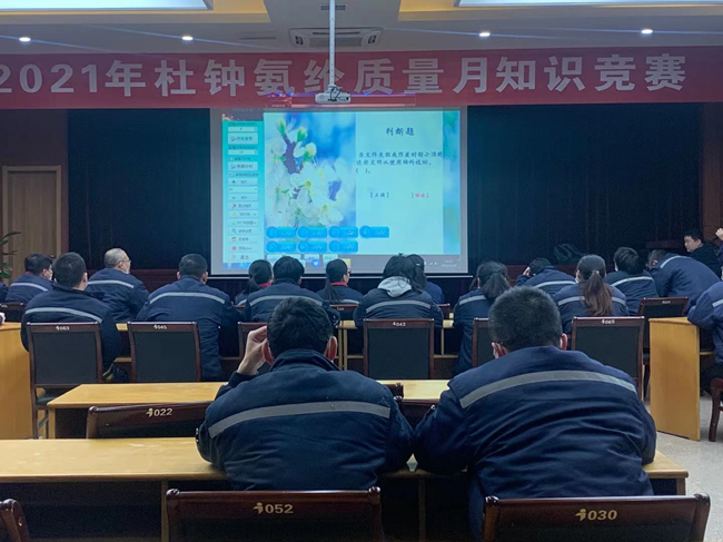 1228下午,為檢驗(yàn)質(zhì)量月活動(dòng)成效,杜鐘氨綸公司于多功能廳舉辦“質(zhì)量月”綜合知識(shí)競(jìng)賽。