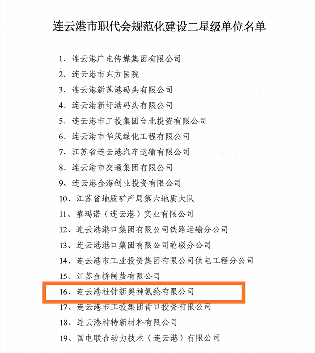 近期,連云港市總工會(huì)對(duì)全市各級(jí)職代會(huì)規(guī)范化建設(shè)表現(xiàn)突出的企事業(yè)單位進(jìn)行了表彰,公司榜上有名,獲評(píng)市“職代會(huì)規(guī)范化建設(shè)二星級(jí)單位”稱號(hào)。