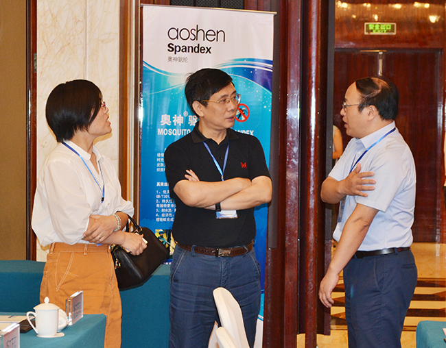 奧神氨綸總經(jīng)理張斌介紹了公司新投放市場的抗菌防臭、芳香驅(qū)蚊、低熔點熱粘合氨綸等新產(chǎn)品。
