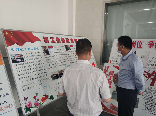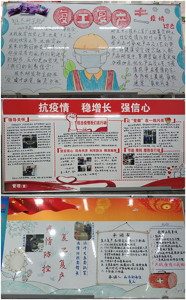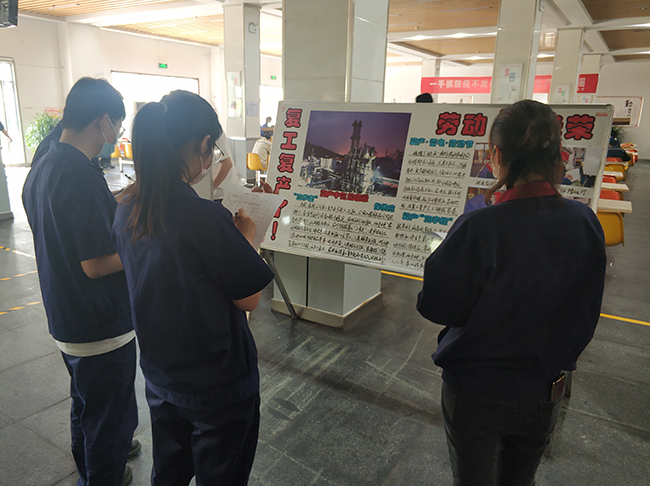 5月21日,公司開展了以“抗疫情•復(fù)工復(fù)產(chǎn)”為主題的板報(bào)評(píng)比活動(dòng)。來自生產(chǎn)一部、生產(chǎn)二部、品保部、公用工程部、生產(chǎn)設(shè)備部、技術(shù)研發(fā)部以及管理部門的7個(gè)部門參加了評(píng)比。