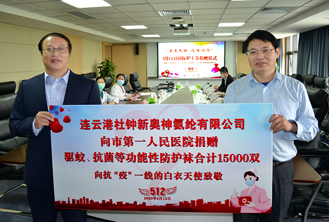 5月12日,連云港杜鐘氨綸有限公司在市總工會的帶領(lǐng)下來到連云港市第一人民醫(yī)院開展愛心捐贈活動。氨綸公司與國內(nèi)知名襪業(yè)公司俏佳人合作使用奧神專利產(chǎn)品訂制了一批“防脫散襪”、驅(qū)蚊襪、抗菌防臭襪等功能性防護襪,共計捐贈15000雙。市總工會副主席、女職委主任秦云;連云港市工業(yè)投資集團工會主席劉承志;市第一人民醫(yī)院副院長、工會主席胡蓉,副院長李明星;連云港杜鐘新奧神氨綸有限公司總經(jīng)理張斌,副總經(jīng)理劉明珠等領(lǐng)導出席捐贈儀式。