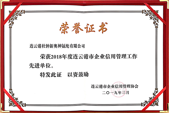 3月21日,在全市企業(yè)信用管理工作表彰大會(huì)上氨綸公司被連云港市企業(yè)信用管理協(xié)會(huì)表彰為“2018年度連云港市企業(yè)信用管理工作先進(jìn)單位”。會(huì)上,共有33家優(yōu)秀企業(yè)獲此殊榮。