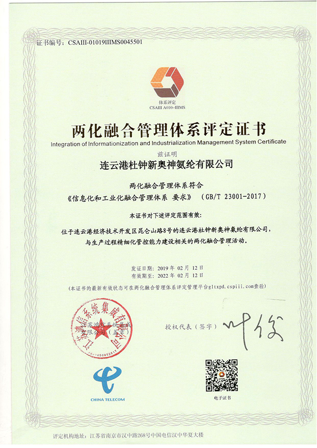 氨綸公司順利取得“兩化融合管理體系評定證書”