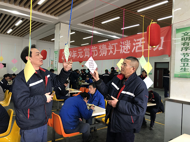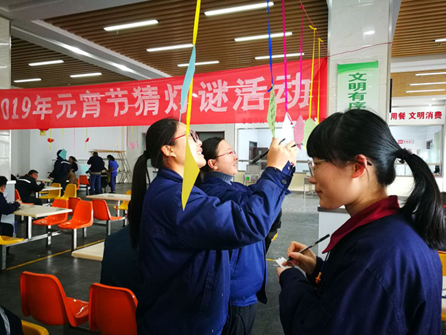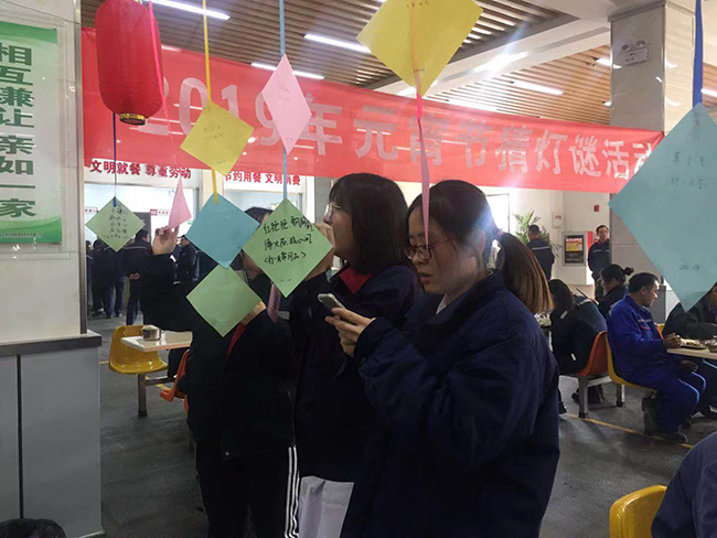 219日正月十五元宵節(jié),氨綸公司舉辦的元宵節(jié)猜燈謎活動在公司食堂如火如荼的展開了。公司食堂懸掛起近百條五顏六色的謎語紙片和燈籠,廣大全體員工踴躍參加。