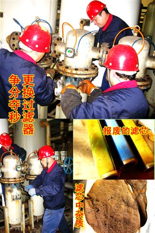 他們中間既有“技能大師”、市級(jí)“五一勞動(dòng)獎(jiǎng)?wù)?rdquo;獲得者設(shè)備“醫(yī)學(xué)專(zhuān)家”—伏彩兵,也有不見(jiàn)經(jīng)傳的普通一線(xiàn)維修員工。近期,公用工程部人員發(fā)現(xiàn)1#空分制氮機(jī)組氣壓降低1個(gè)表壓,能耗上升,氮?dú)饧兌群彤a(chǎn)氣量雙降,有報(bào)警停車(chē)隱患,經(jīng)維修和自主維修“醫(yī)生”緊急會(huì)診,診斷為“芯梗”,需要立即“換芯”(更換空氣過(guò)濾器濾芯),面對(duì)突發(fā)情況,為保證生產(chǎn)安全運(yùn)行,維修人員自覺(jué)加快維修進(jìn)度,加班加點(diǎn)開(kāi)展濾筒解體,吊裝,換芯,復(fù)位等工作,提前兩小時(shí)完成搶修任務(wù),原“芯梗”制氮機(jī)組進(jìn)氣運(yùn)行后壓力恢復(fù)正常,隱患解除。