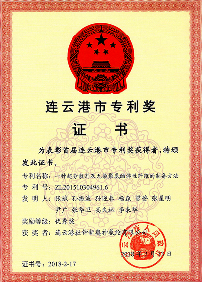 近日,氨綸公司“一種超分散劑及無(wú)染聚氨酯彈性纖維的制備方法”發(fā)明專(zhuān)利(專(zhuān)利號(hào):ZL201510304961.6)獲得首屆連云港市專(zhuān)利優(yōu)秀獎(jiǎng)。 據(jù)悉,本屆市專(zhuān)利獎(jiǎng)共有30項(xiàng)專(zhuān)利獲獎(jiǎng),包括10項(xiàng)金獎(jiǎng), 20項(xiàng)優(yōu)秀獎(jiǎng)。