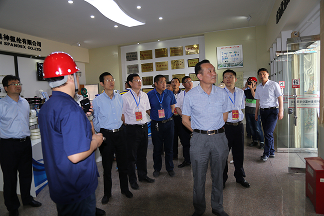 2017525日,由市人大常委會(huì)領(lǐng)導(dǎo)陳敏帶隊(duì),省市縣三級(jí)人大代表組成的視察組一行25人,在工投集團(tuán)董事長(zhǎng)楊龍、總經(jīng)濟(jì)師陳如軍等陪同下赴我公司參觀考察,代表團(tuán)先后參觀我了公司展廳、工程建設(shè)現(xiàn)場(chǎng)及7期項(xiàng)目生產(chǎn)線,氨綸公司總經(jīng)理張斌進(jìn)行了情況介紹。