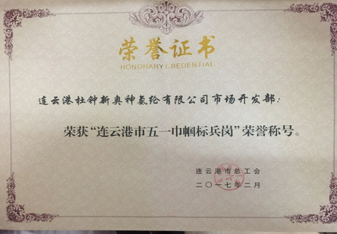 在集團(tuán)公司的指導(dǎo)關(guān)心下,連云港杜鐘新奧神氨綸有限公司市場開發(fā)部團(tuán)結(jié)一致、攻堅克難,在市場開拓方面做出了突出貢獻(xiàn)。經(jīng)連云港市總工會評選,榮獲“連云港市五一巾幗標(biāo)兵崗”榮譽(yù)稱號。