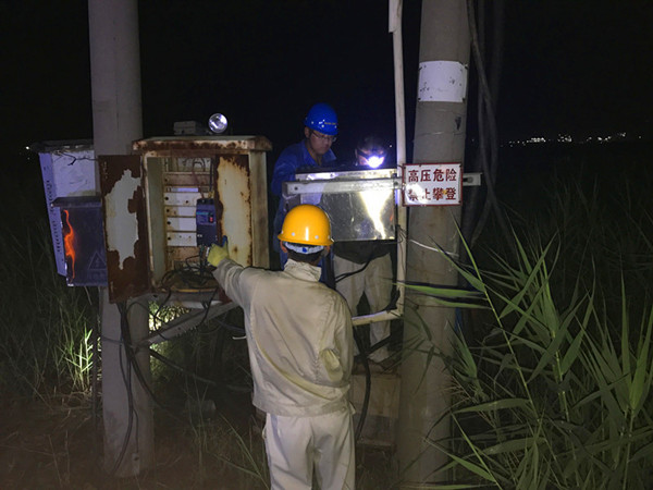 7月30日晚,臺(tái)南供電所員工在蒿西養(yǎng)殖區(qū)緊急處理由于過負(fù)荷導(dǎo)致的配電箱電表線路故障。入伏以來,連云港氣溫居高不下,電網(wǎng)負(fù)荷持續(xù)走高,7月30日晚21點(diǎn),由于用電負(fù)荷突增,蒿西養(yǎng)殖區(qū)發(fā)生配電箱電表線路故障,接到報(bào)修電話后,該所值班工作人員迅速備件,冒著高溫、悶濕的條件下進(jìn)行緊急搶修。圖為工作人員正在安裝配電箱電表接線。此次新招2名實(shí)習(xí)員工也參加了該項(xiàng)搶修任務(wù)。截止當(dāng)晚11時(shí)蒿西養(yǎng)殖區(qū)及其周邊已送電成功。