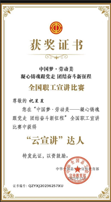 近日,全國總工會公布了“中國夢·勞動美——凝心聚魂跟黨走 團結(jié)奮斗新征程”全國職工“云宣講”比賽結(jié)果,我公司勞模祝星星同志喜獲“云宣講”達人稱號。