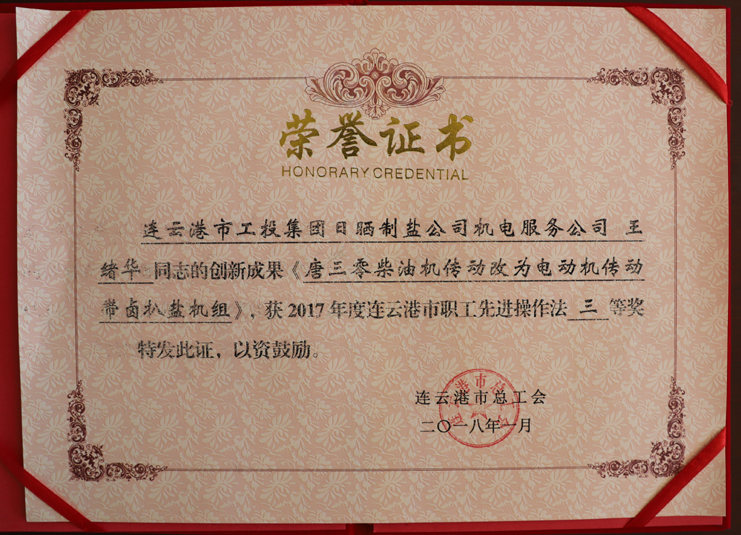 近日,日曬制鹽新河制鹽分公司安樹林同志的創(chuàng)新成果《輕型自吸式電動(dòng)履帶扒鹽機(jī)》,被市總工會(huì)評為2017年度連云港市職工先進(jìn)操作法二等獎(jiǎng),日曬制鹽公司機(jī)電服務(wù)公司王緒華同志的創(chuàng)新成果《唐三零柴油機(jī)傳動(dòng)改為電動(dòng)機(jī)傳動(dòng)帶鹵扒鹽機(jī)組》,被市總工會(huì)評為2017年度連云港市職工先進(jìn)操作法三等獎(jiǎng)。(西工)