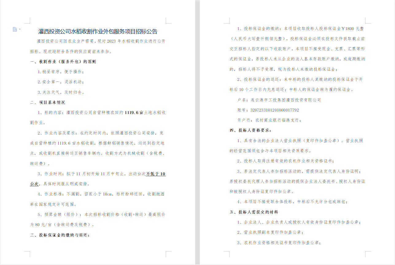 灌西投資公司水稻收割作業(yè)外包服務(wù)項目招標(biāo)公告
