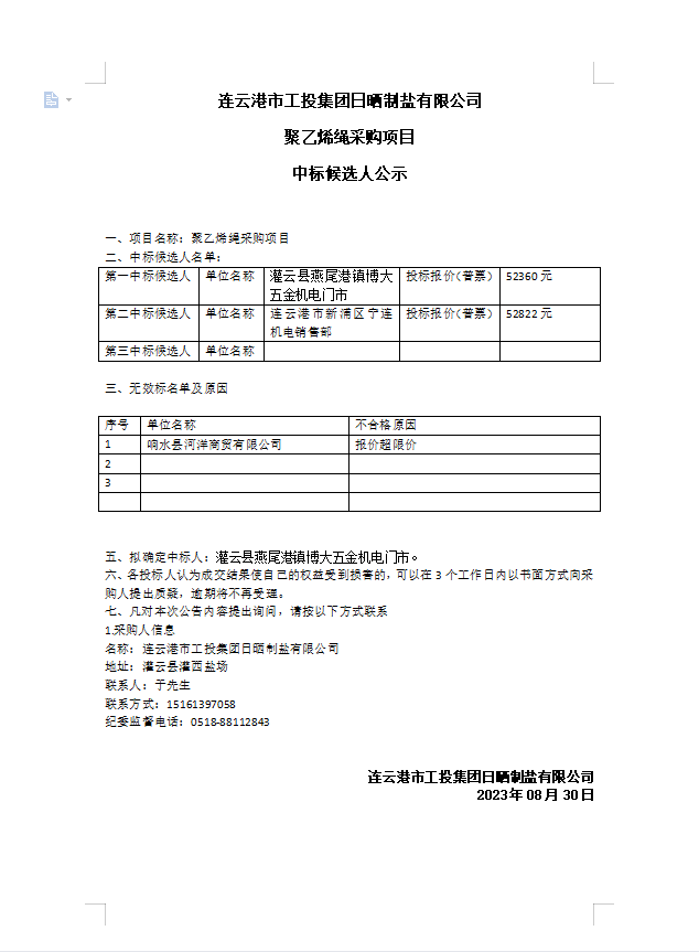 連云港市工投集團日曬制鹽有限公司聚乙烯繩采購項目中標候選人公示