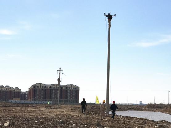 3月14日,臺南供電所職工正在加緊對張圩小區(qū)10kv供電線路進(jìn)行導(dǎo)線架設(shè)。