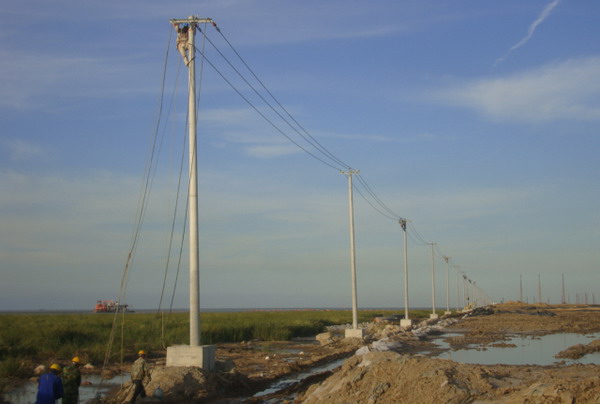 連云新城三期供電線路緊貼海堤邊。受海堤建設(shè)進(jìn)度和海風(fēng)海潮的影響,低矮的壩堤經(jīng)常被風(fēng)刮起的海浪浸頂,石塊突起,洼水漣漪,淤泥纏足,堤邊路面凹凸不平,道路僅限一輛車通行,擁擠不堪,工程施工難度極大。為提升速度,加快進(jìn)度,臺(tái)北供電所克服困難,緊鑼密鼓地展開工作,以期早日完工。現(xiàn)場(chǎng)勘察地形地貌,了解潮汐運(yùn)動(dòng)規(guī)律,制定施工計(jì)劃,設(shè)計(jì)措施方案,組織人力,采購材料,投入施工。施工人員采用彈性工作時(shí)間,利用落潮時(shí)機(jī),搶運(yùn)電桿,及時(shí)立桿和裝配。職工們發(fā)揚(yáng)不怕苦,不畏難的精神,不懼海風(fēng)吹臉、海水浸衣,爬上距離海平面二十多米仿佛搖擺不定的高桿,懸在空中一絲不茍地操作,保障了工程的全面竣工。