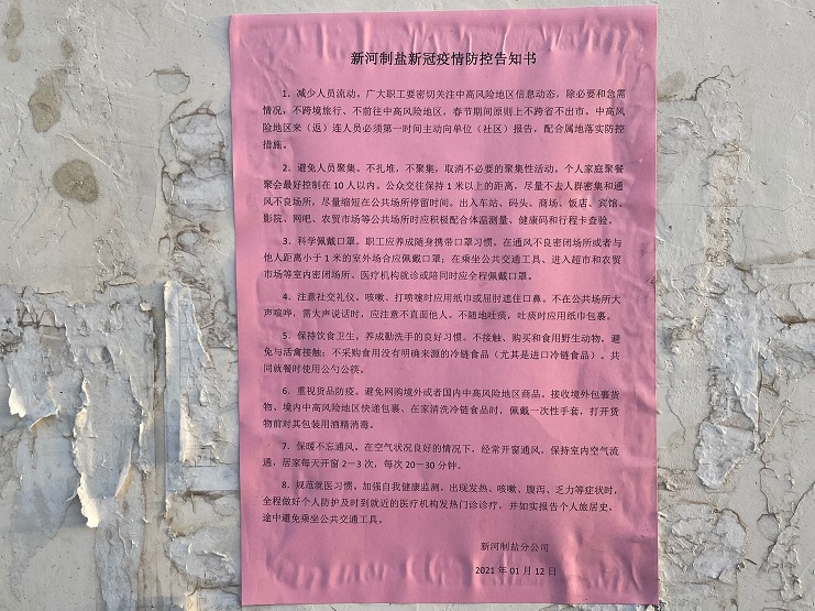 春節(jié)臨近,人員流動增加,根據灌西投資公司疫情防控工作的需要,結合冬春季疫情形勢,為切實加強生產一線疫情防控工作 ,進一步防范疫情輸入,提高職工自我防護意識,新河制鹽分公司1月12日在公司醒目位置張貼《疫情防控告知書》,并對各個班組發(fā)放《疫情防控告知書》,每位員工簽字并存檔。