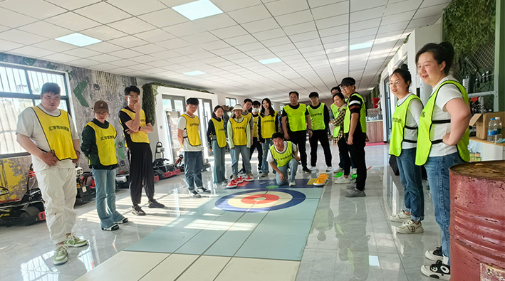 30余名青年骨干依次分成兩隊進行團隊拓展比賽,大家在暖場游戲破冰行動中相互熟悉。緊接著大家按照隊伍分組開展訓(xùn)練游戲,訓(xùn)練中大家集中精力,相互扶持幫助,共同完成對戰(zhàn)。其中冰壺游戲考驗每位青年的耐心和定力,需要瞄準方向,掌握好力度,共同協(xié)作得出好成績。多個極富挑戰(zhàn)性的項目在大家的齊心協(xié)力下順利完成。整場活動現(xiàn)場氣氛活躍,盡顯青春活力,比賽的形式也將本次活動推向了高潮。